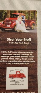 Here comes the bride, all dressed in white……. Here comes the truck, all dressed in red……..! Renting our little red truck as a photography prop for weddings seemed like a great first step in starting a viable small business! We created business cards, brochures and started to navigate the beginnings of an online presence. Our excitement spilled over with several late night think tank sessions that included all sorts of creative ways that our newly acquired vintage find could strut and shine! Grand openings, graduation parties, family reunions, church and corporate events. Including an occasional, “pop up” photo shoot brought our newly launched plan right up to speed with all things trending! We were out of the gate and rolling along!